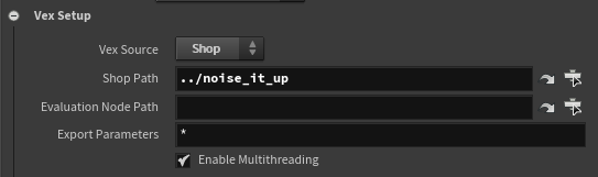 - Select the empty VOP network, and set the Vex Source parameter to Shop.